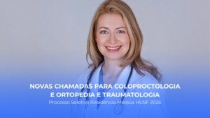O HUSF convoca as candidatas: Letycia Rodrigues Maione e Beatriz Tolomelli Nunes, para os Programas de Residência Médica em Coloproctologia e Ortopedia/Traumatologia, respectivamente. As candidatas devem manifestarem sua decisão acessando